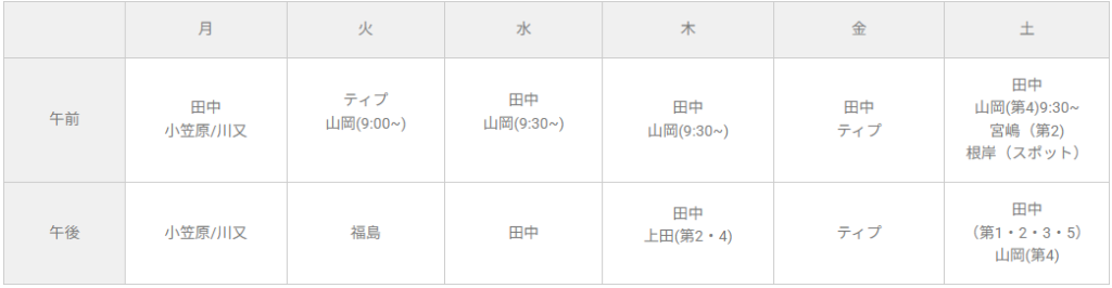 | 午前 | 田中 小笠原/川又 | ティプ | 田中 | 田中 山岡(9:30~) | 田中 ティプ | 田中 山岡(第4)9:30~ 宮嶋(第2) 根岸(スポット) |