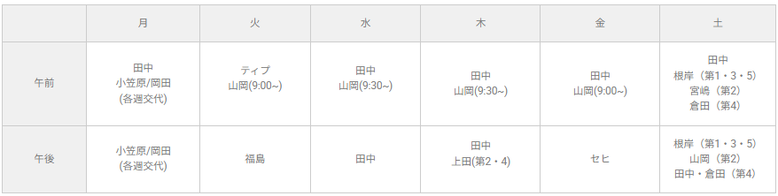 | 午前 | 田中 小笠原/岡田 (各週交代) | ティプ | 田中 | 田中 山岡(9:30~) | 田中 山岡(9:00~) | 田中 根岸(第1・3・5) 宮嶋(第2) 倉田(第4) |